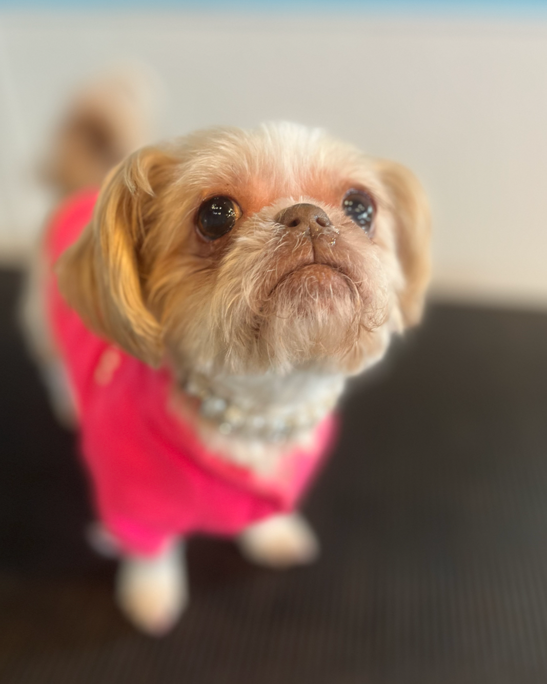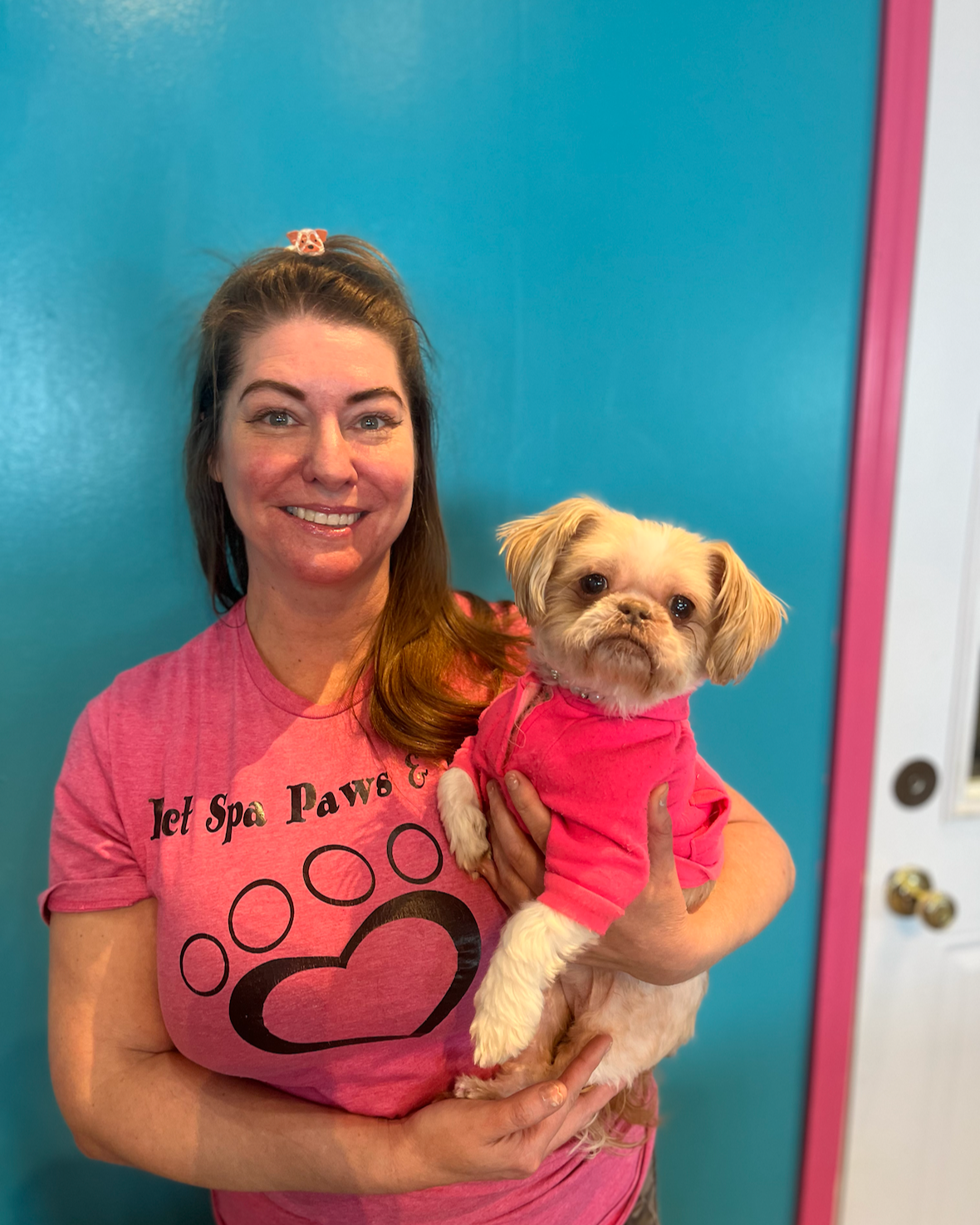 Today, Jojo proudly serves as the spa mascot and unofficial supervisor, making sure everything stays in tip-top shape. She’s adored by staff, clients, and pups alike, bringing comfort, charm, and personality to the salon every day.